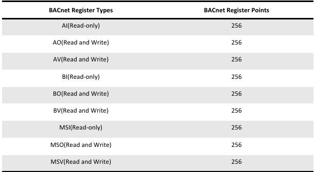 The BACnet gateway supports a BACnet IP server, which supports the following register types and maximum number of points as shown in the table.