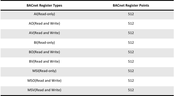 The BACnet gateway supports a BACnet IP server, which supports the following register types and maximum number of points as shown in the table.