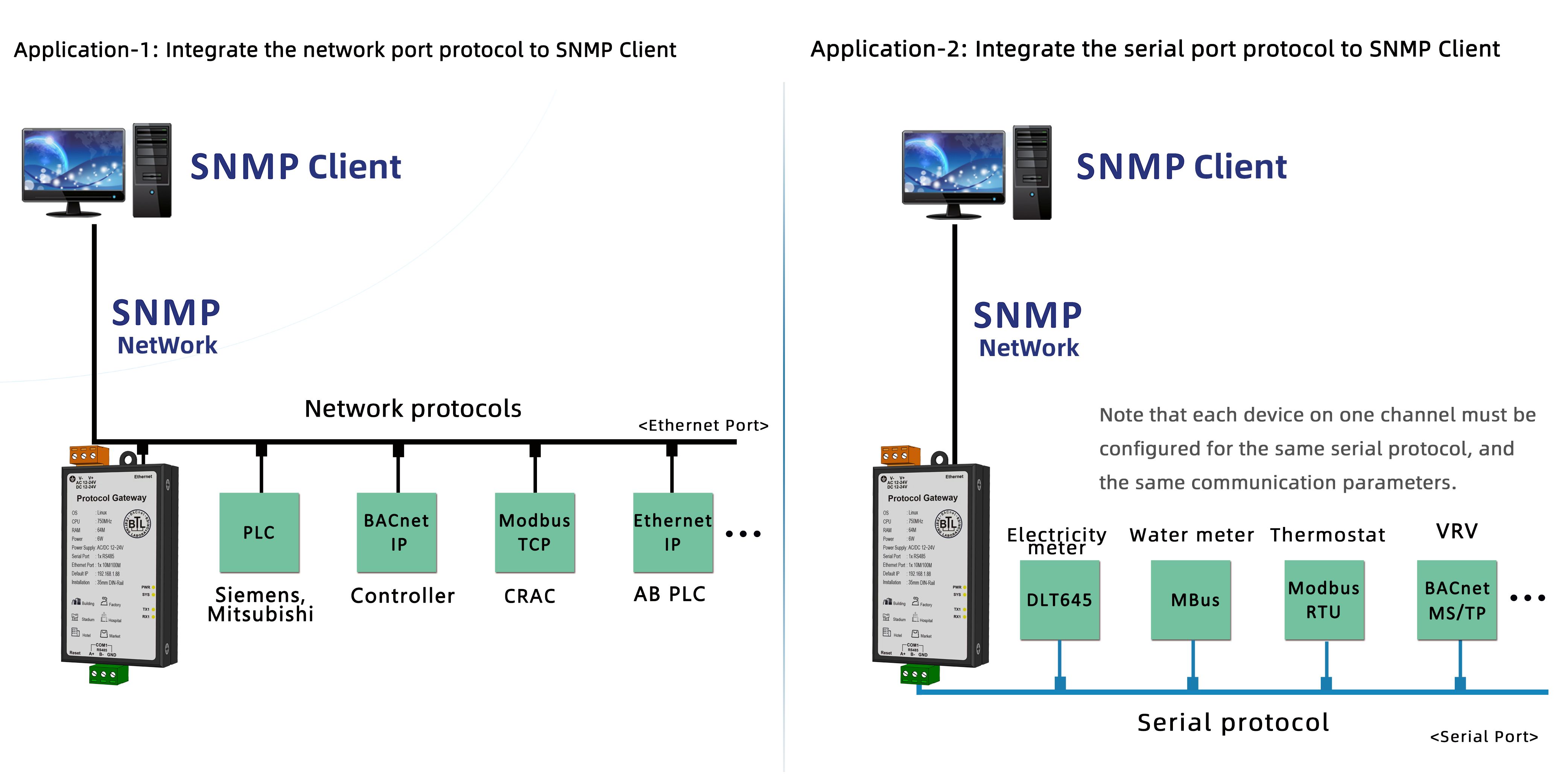 SNMP Gateway, SNMP1001-ARM (featuring 1 Ethernet port and 1 RS485 serial port, dynamically supporting 256 points). It can convert Modbus RTU and more than 500 protocols to SNMP server.