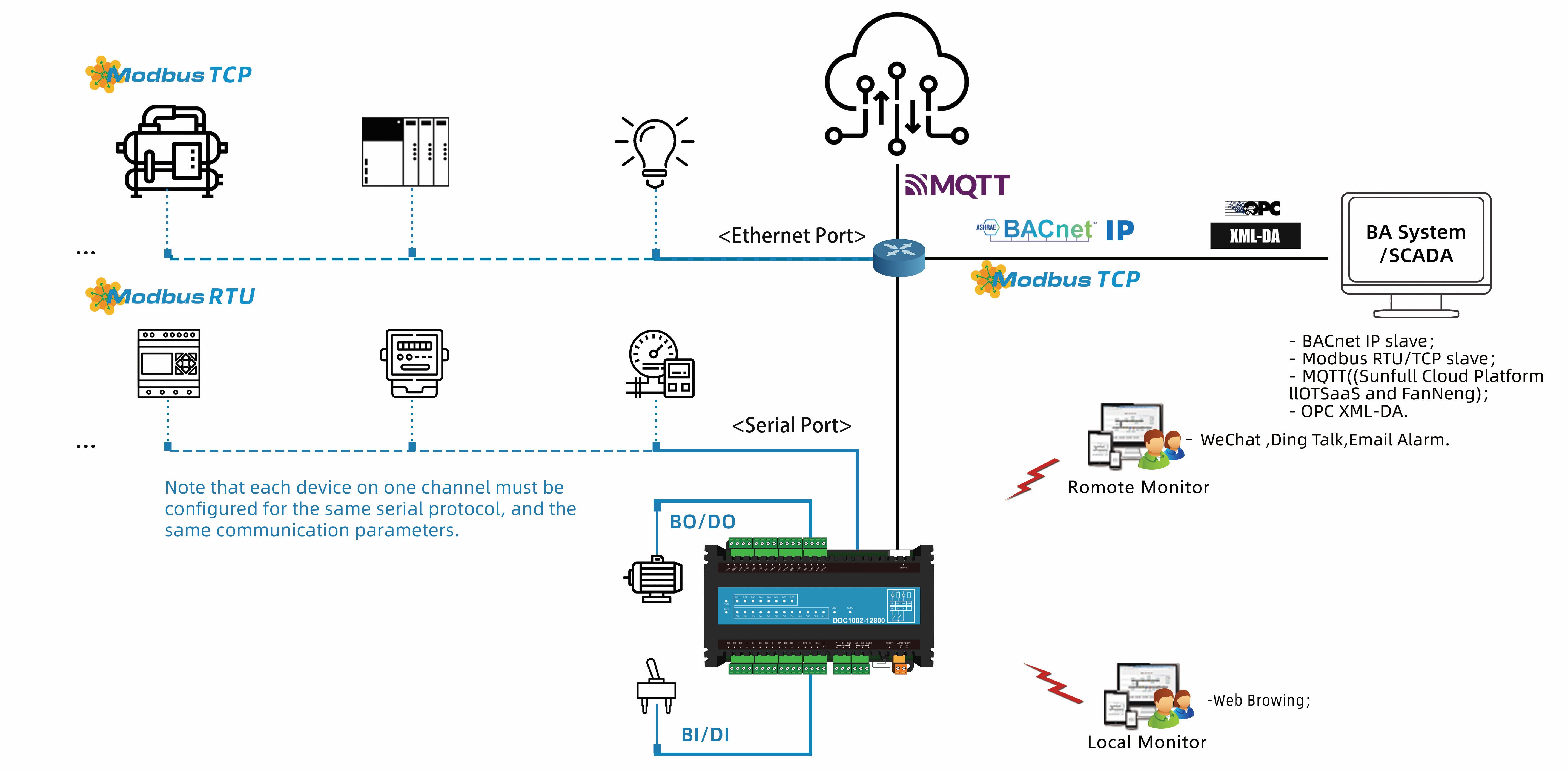 User can configure the project according to the communication protocol document of on-site Modbus RTU/TCP device , and convert it to a standard BACnet IP and Modbus TCP server. After monitoring successfully on the local monitor mode, upload the project file to DDC module to access the data of on-site device (Note: The decimal address of the collection end starts from 1 (Base1), and the hexadecimal address starts from 0 (Base0); The Modbus register base address of the transfer end starts from 1 (Base1).