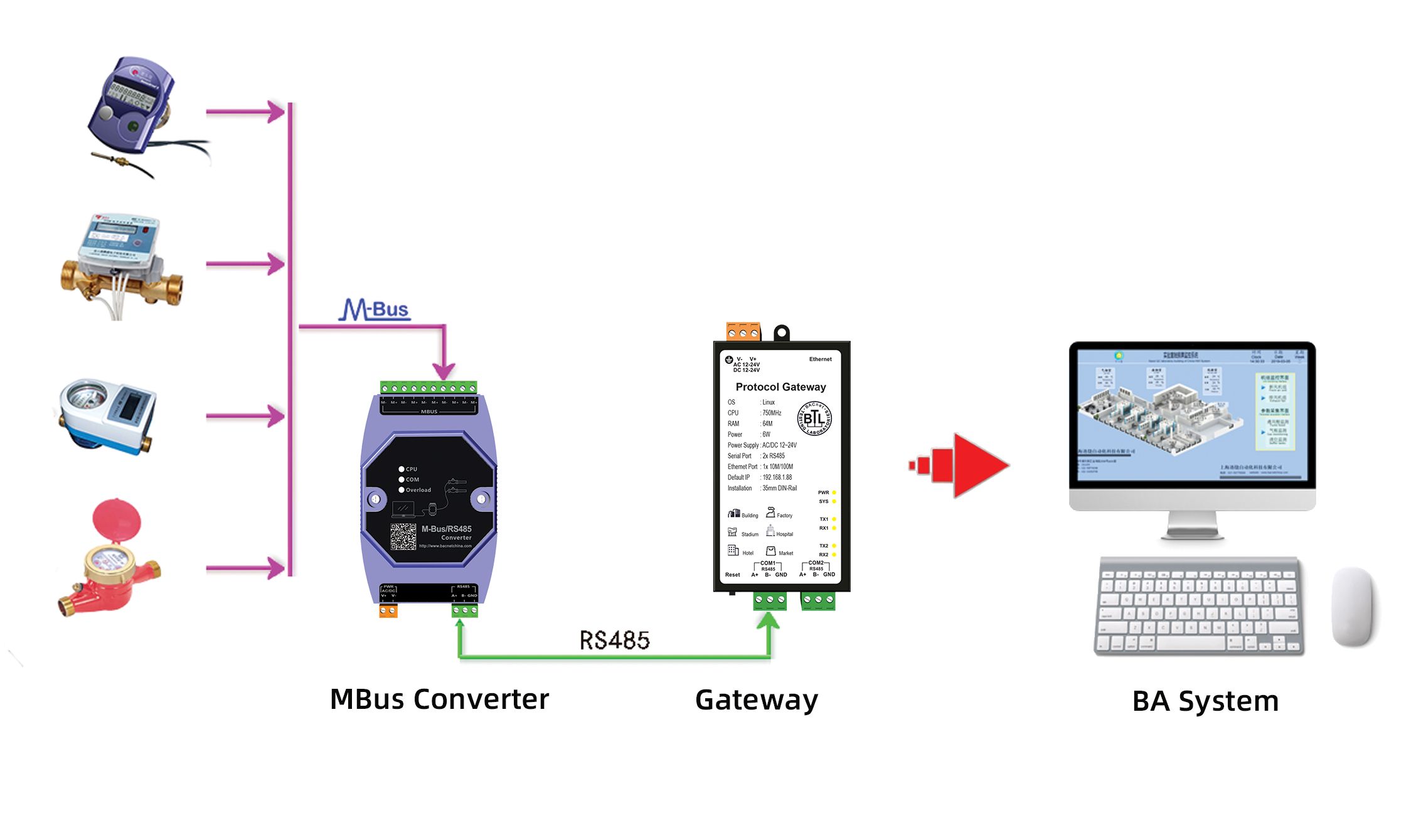 Mbus介绍 M-Bus远程抄表系统(symphonic mbus)是欧洲标准的2线的二总线,主要用于消耗测量仪器,诸如热表和水表,流量计系列。 Mbus总线是欧洲标准,与普通485总线主要区别在于: 1, Mbus总线工作是有30~36V工作电压,用于仪表传输数据;485总线一般工作电压是3.8V左右; 2, Mbus可以完全支持星型连接方式总线,485总线常规都是需要手拉手串联方式; Mbus集中器工作原理 迅饶Mbus集中器通过Mbus接口连接到仪表Mbus总线,然后转换为RS485电平方式,这样可以让PC上位机或者串口设备访问终端仪表。 接线图 XR1005-MBus转换模块,提供M-Bus总线至RS485总线转换服务; 供电:AC/DC24V Mbus接线:5组Mbus总线Mbus+,Mbus-(每组不超过32台设备) 通信口:隔离RS485通信的A+/B-信号线