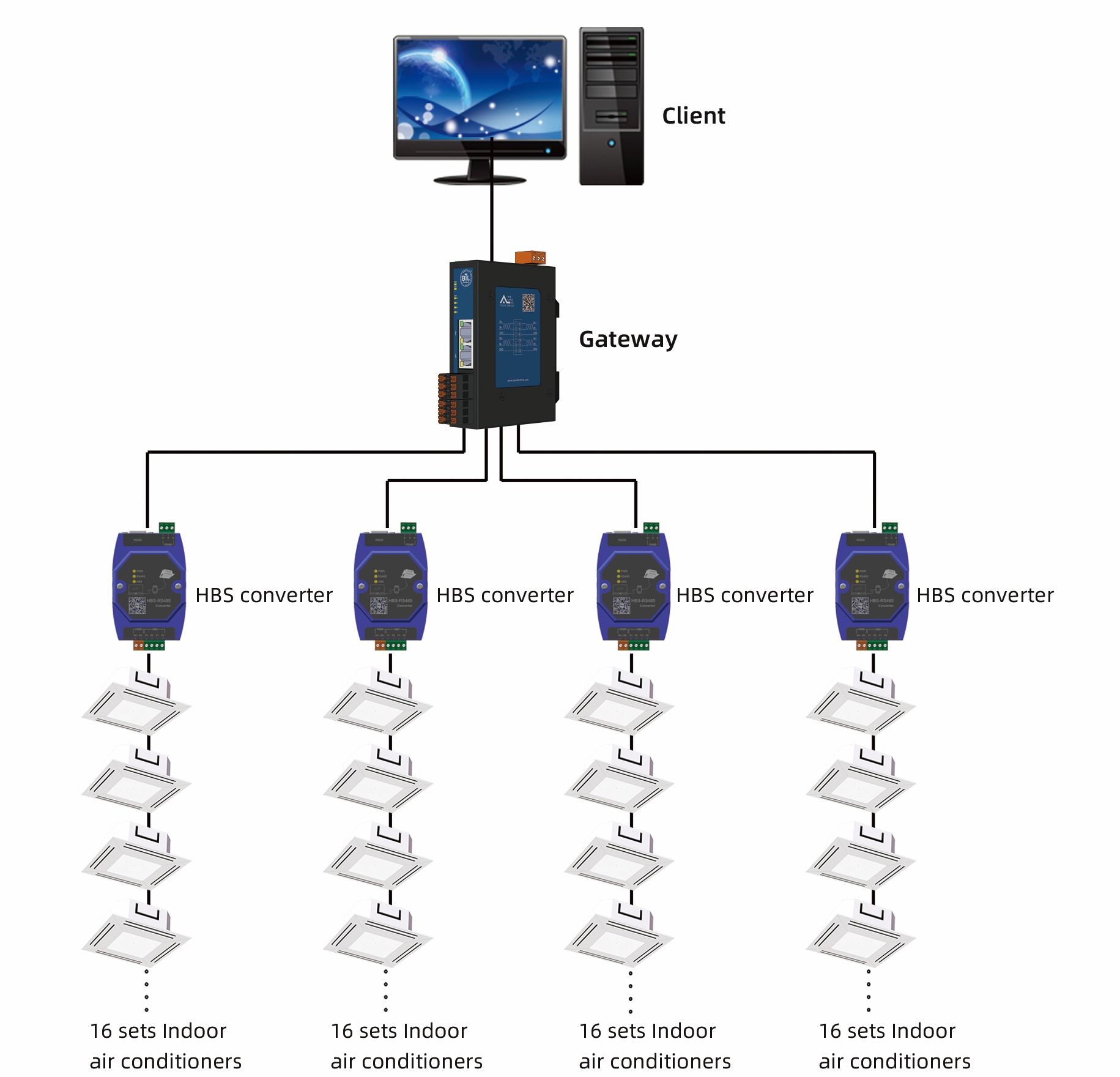 HBS-Modbus转换模块,提供大金空调HBS总线至ModbusRTU的转换服务; 供电:DC12V~24V HBS接线:大金空调内机F1/F2信号线 通信口:隔离RS485通信的A+/B-信号线