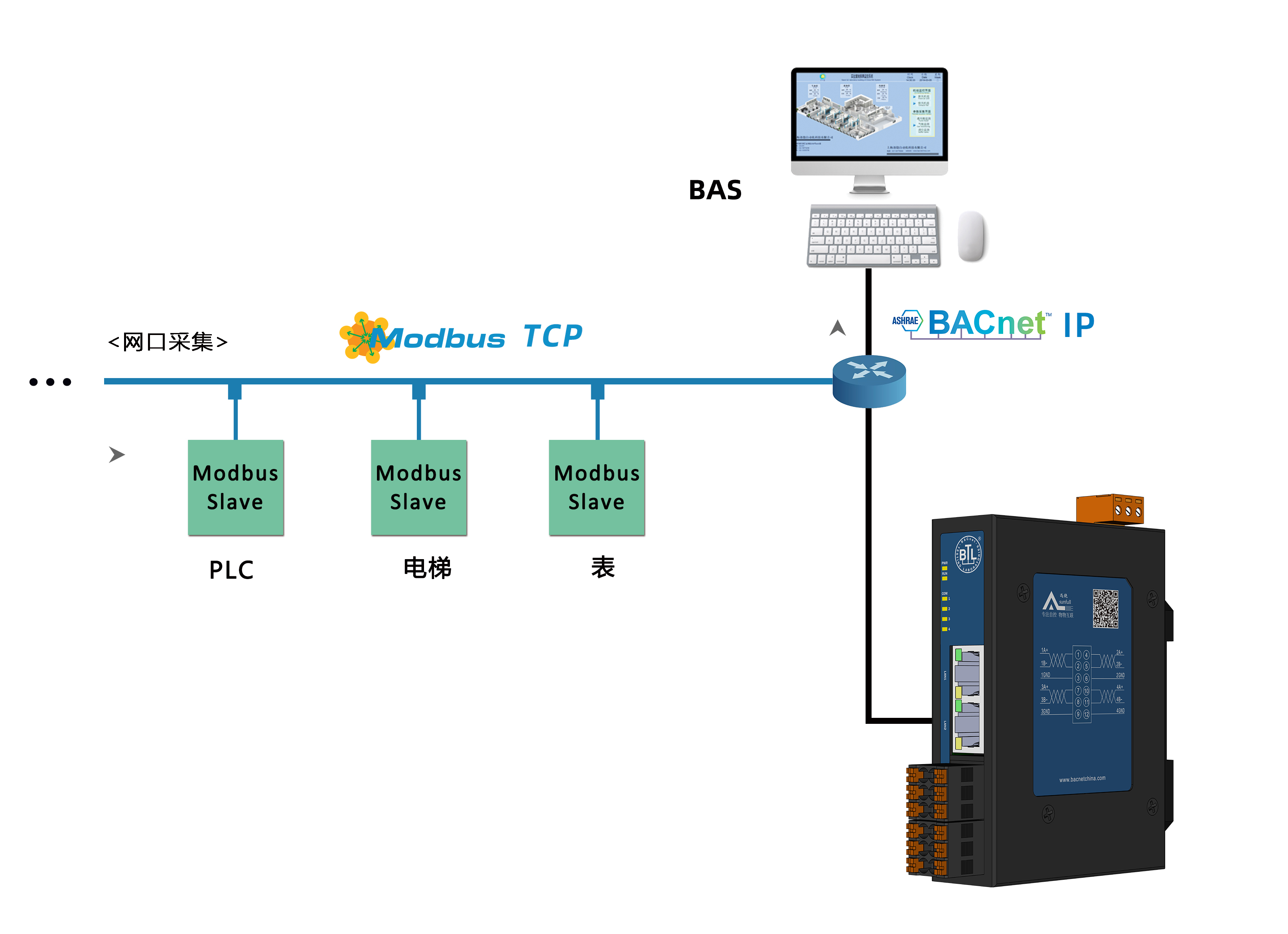 用于解决Honeywell,西门子,江森的Metasys、霍尼的EBI或者Niagara、施耐德TAC、加拿大Delta的ORCAview等大型楼宇自控公司组态软件无法连接一些不常见的控制设备问题,如PLC、空调、电梯、消防、灯光控制系统、电表、水表等。